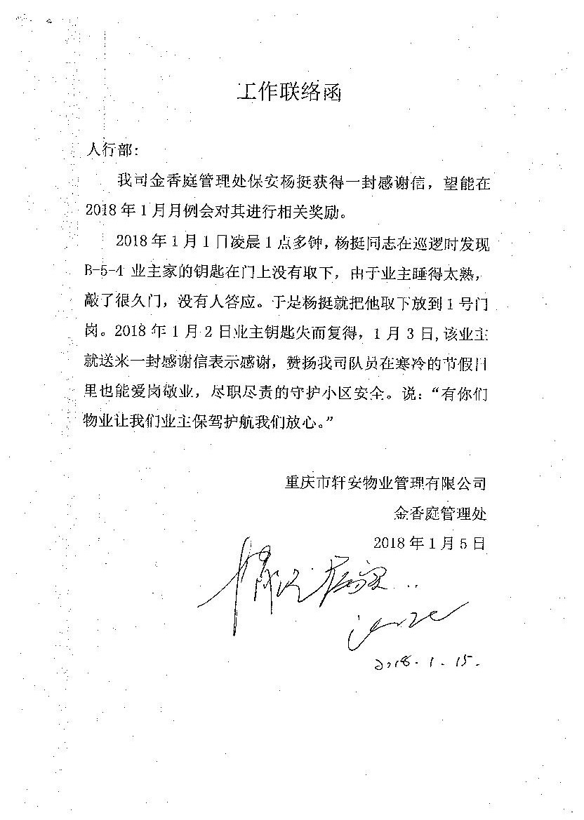 來自軒安物業(yè)的保安員楊挺認(rèn)真盡責(zé)的工作態(tài)度與全心全意為業(yè)主著想的品質(zhì)深深感動(dòng)了業(yè)主,他們?cè)诘谝粫r(shí)間送來感謝信,贊揚(yáng)中威戰(zhàn)士楊挺盡職盡職。